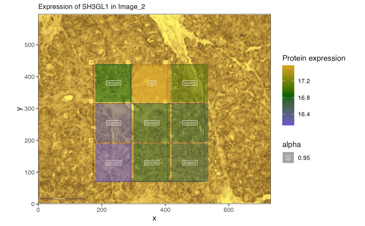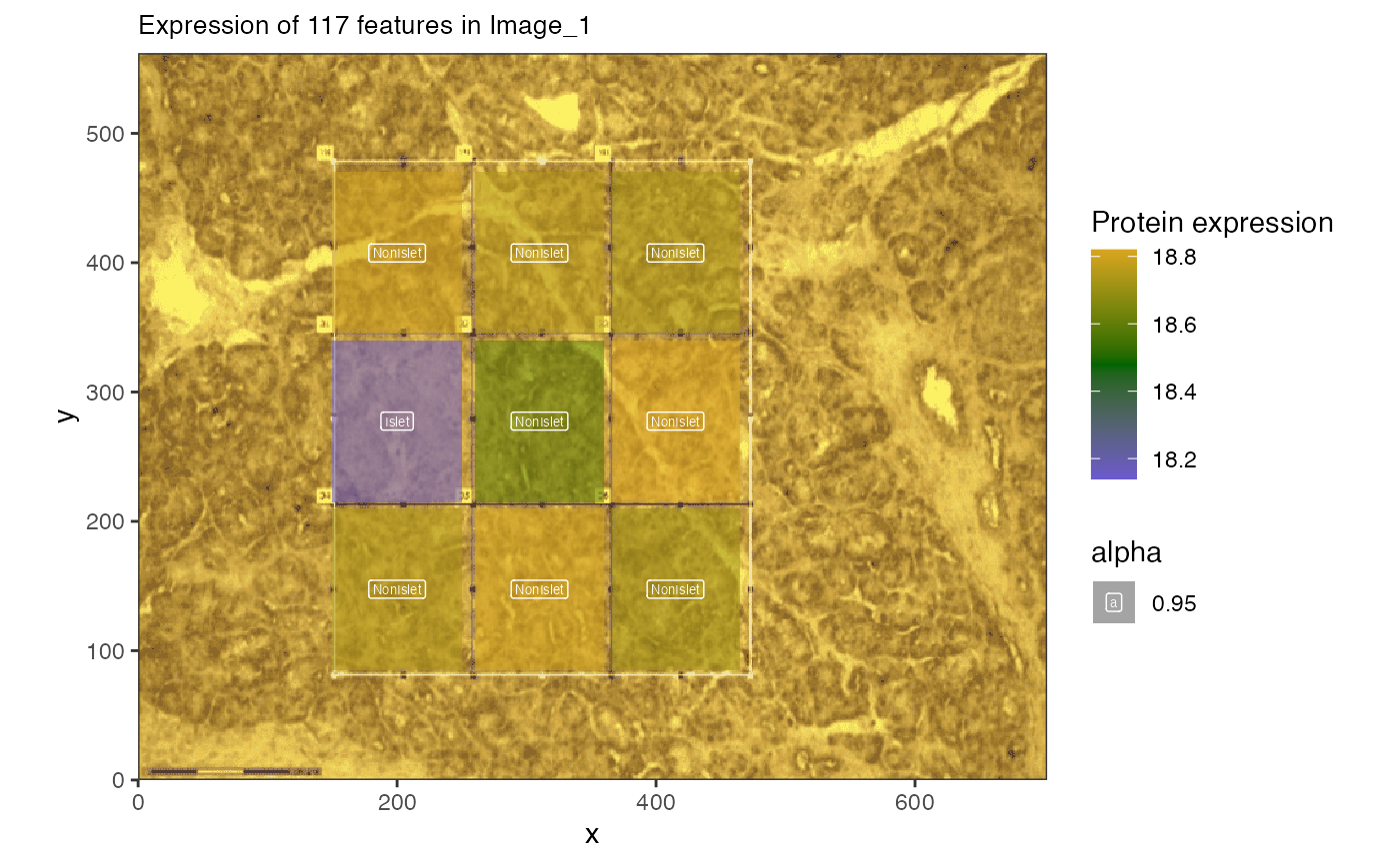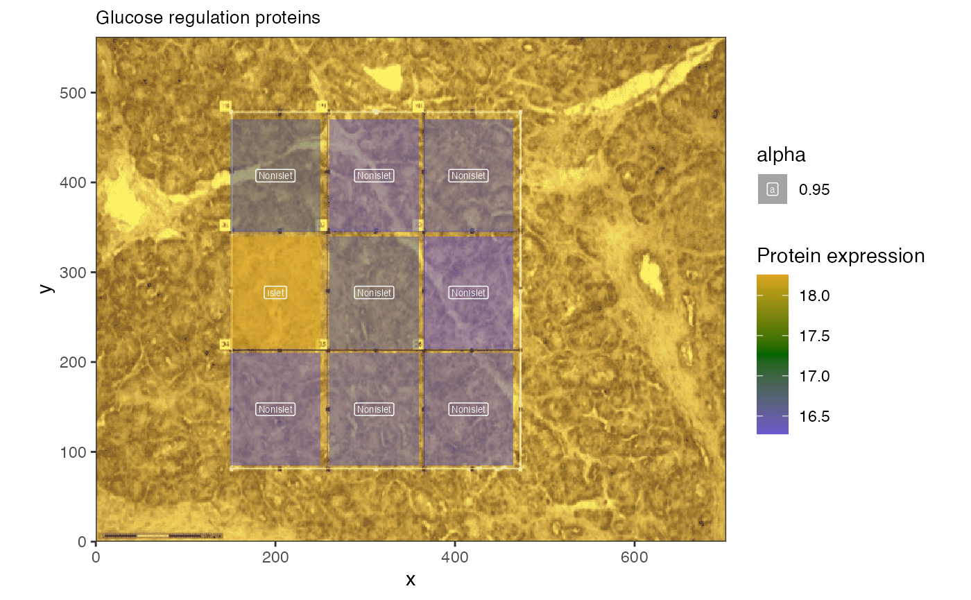 To evaluate the features of this package we are using pancreatic data from Gosline et al. that is captured using mass spectrometry measured from 7 independent regions of a single human pancreas. Each image is segmented into nine ‘voxels’, with one voxel per image representing a cluster of islet cells.