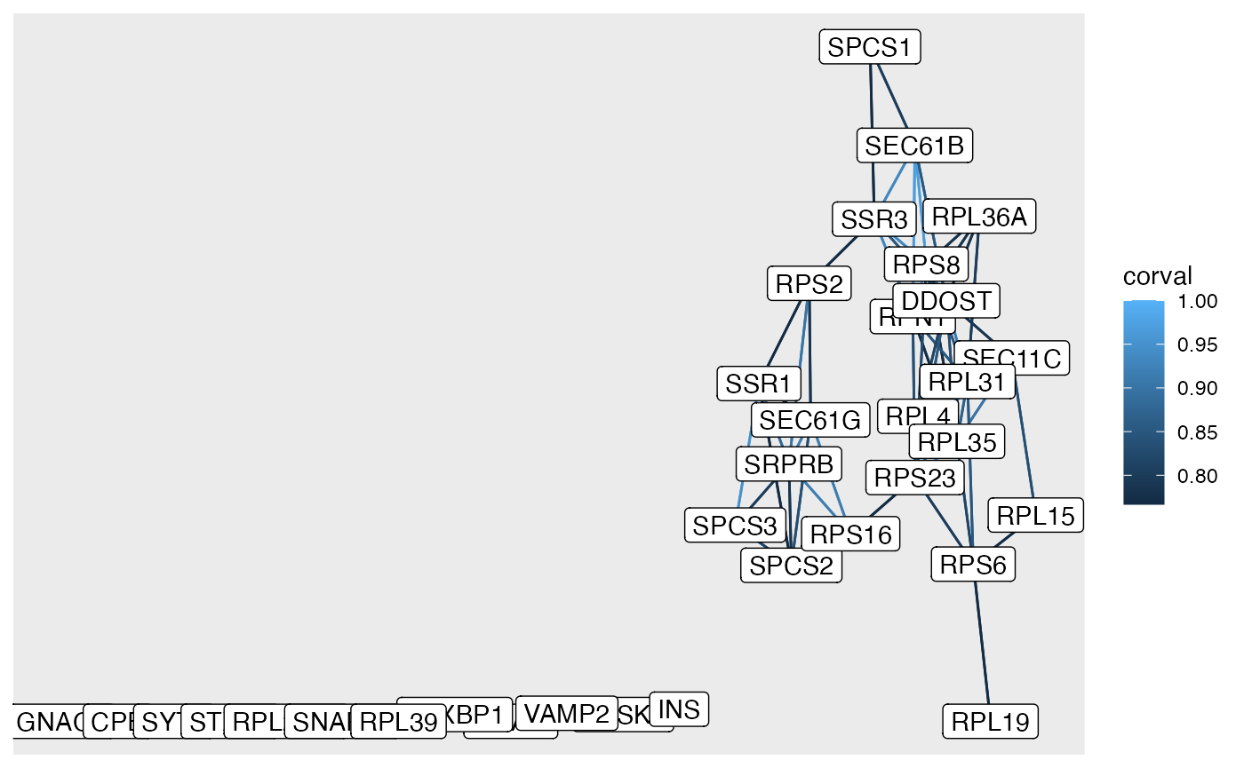 We can also look at the correlation of the ribosomal proteins in a graph. The correlation code takes a while but then we can reduce the graph to the proteins we are most interested in, or those that are most correlated.